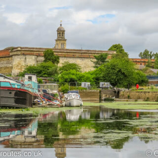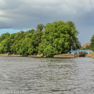 Entering the basin above the flood barrier on the River Foss in York. The basin curves to the right towards Castle Mills Lock.