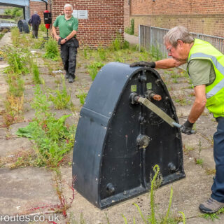 One of the volunteers putting the large windlass onto the winding mechanism ready to open the bottom gate on Castle Mills Lock on the River Foss in York.
