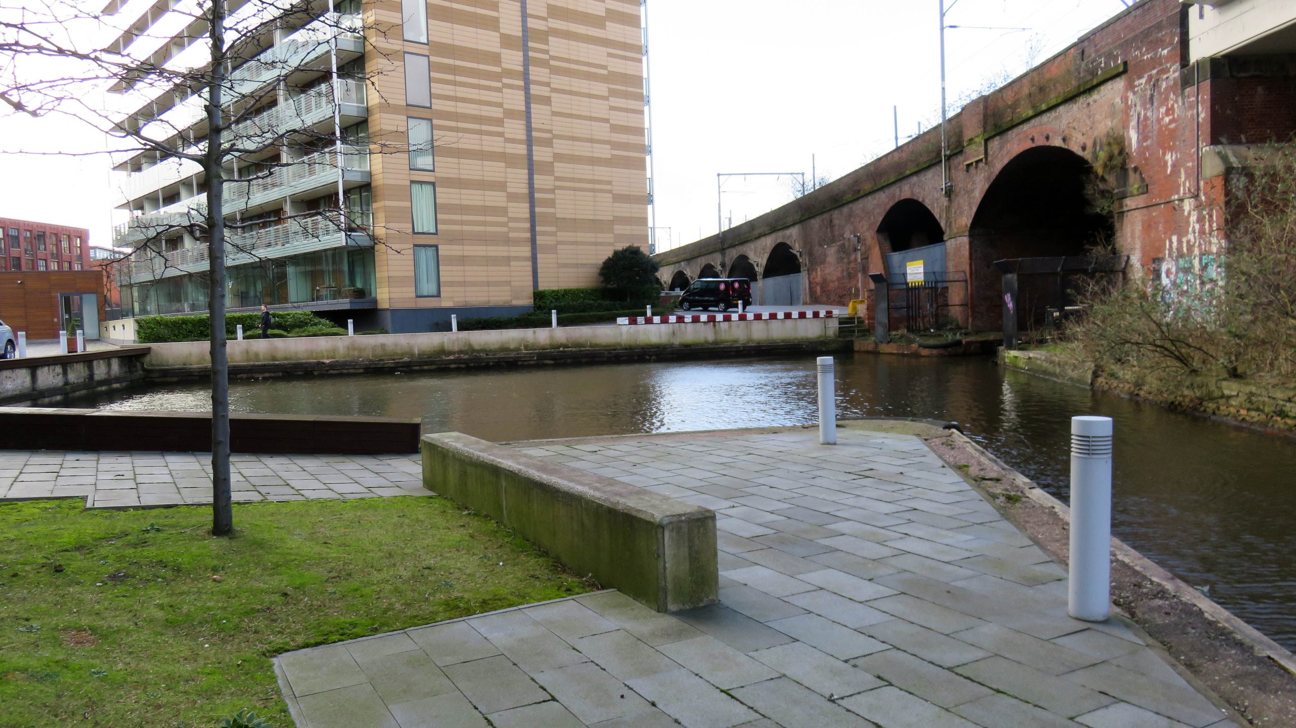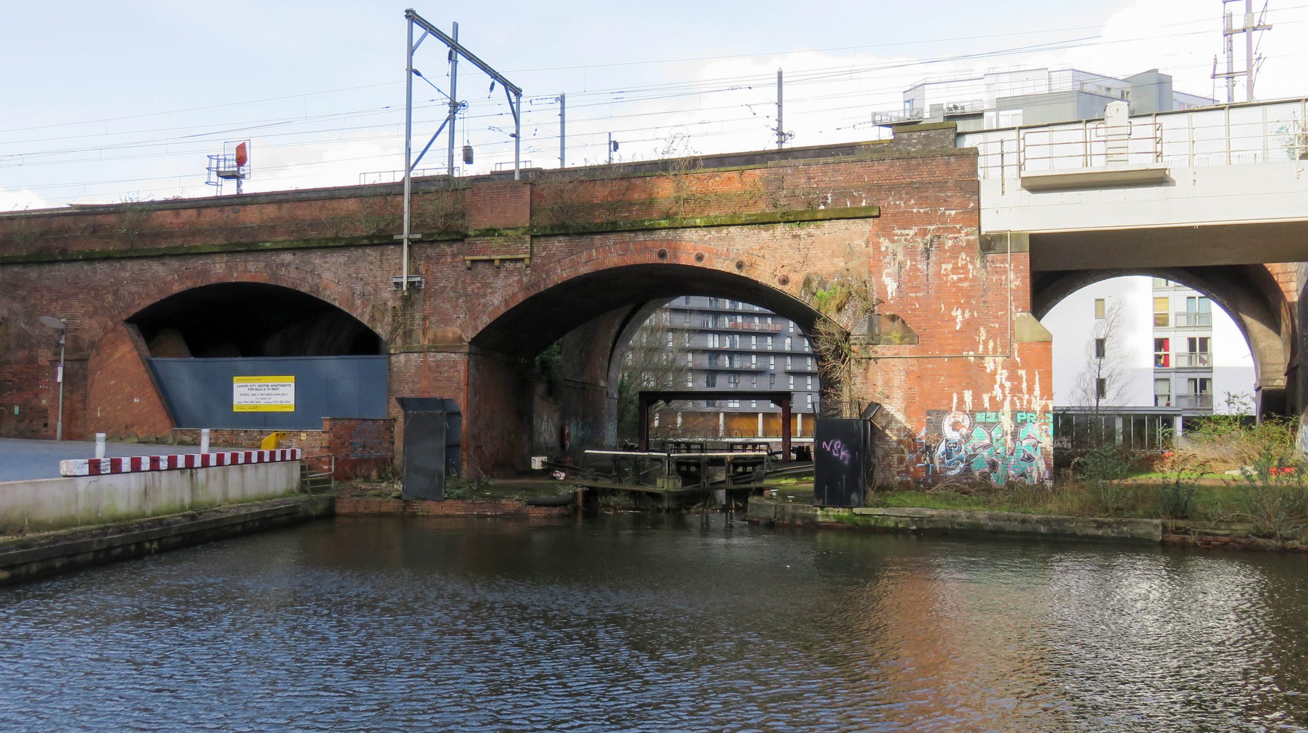 < JUMP TO Hulme Locks Branch Next > < Hulme Locks Jn Hulme Locks Jn > The lower end of the former Hulme Locks Branch of the Bridgewater Canal emerges from the leftmost visible arch of...