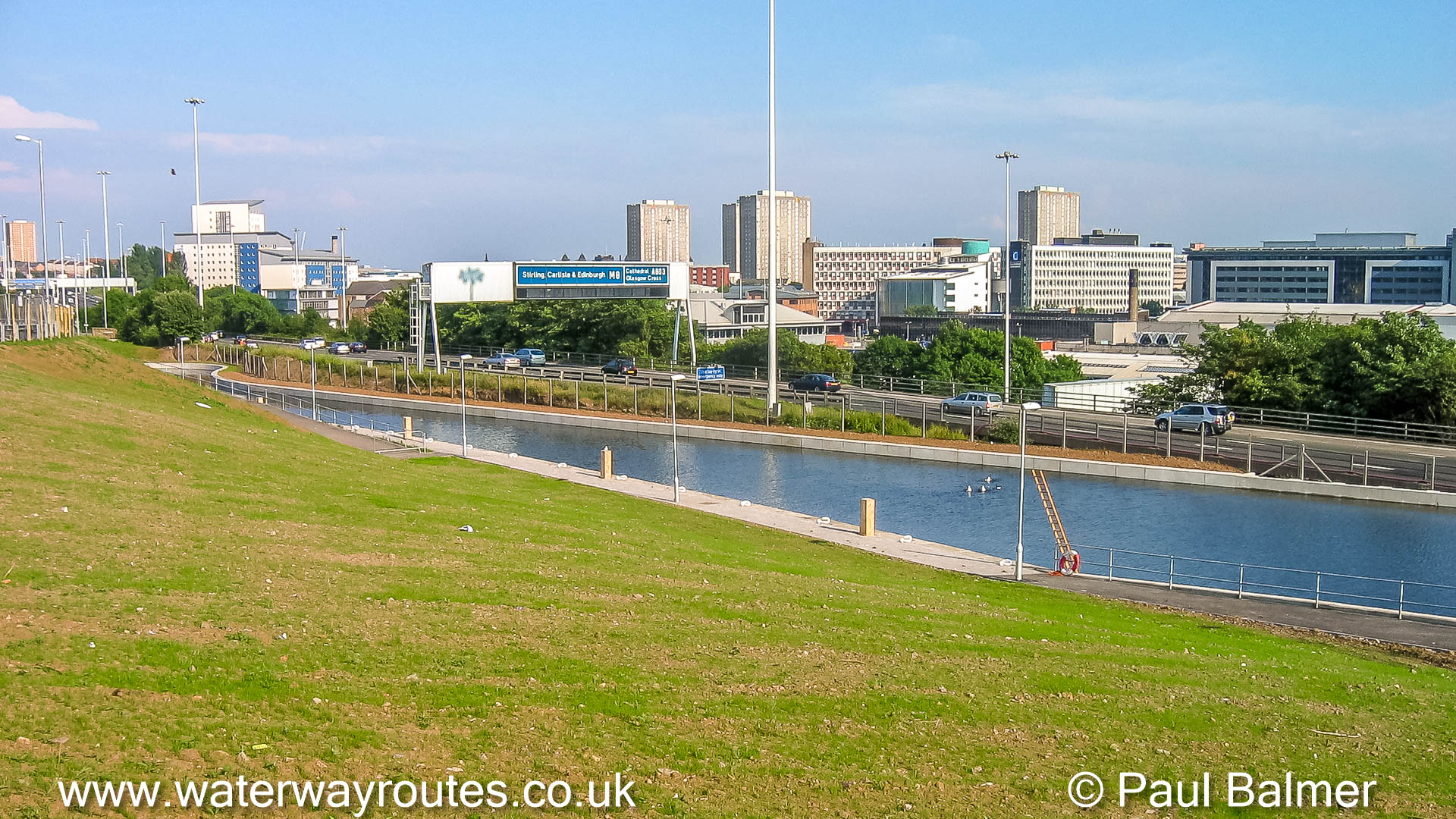 The restored and re-routed Glasgow Branch runs next to the M8 Motorway where the noise from the traffic is much too loud to make mooring there a pleasant experience.