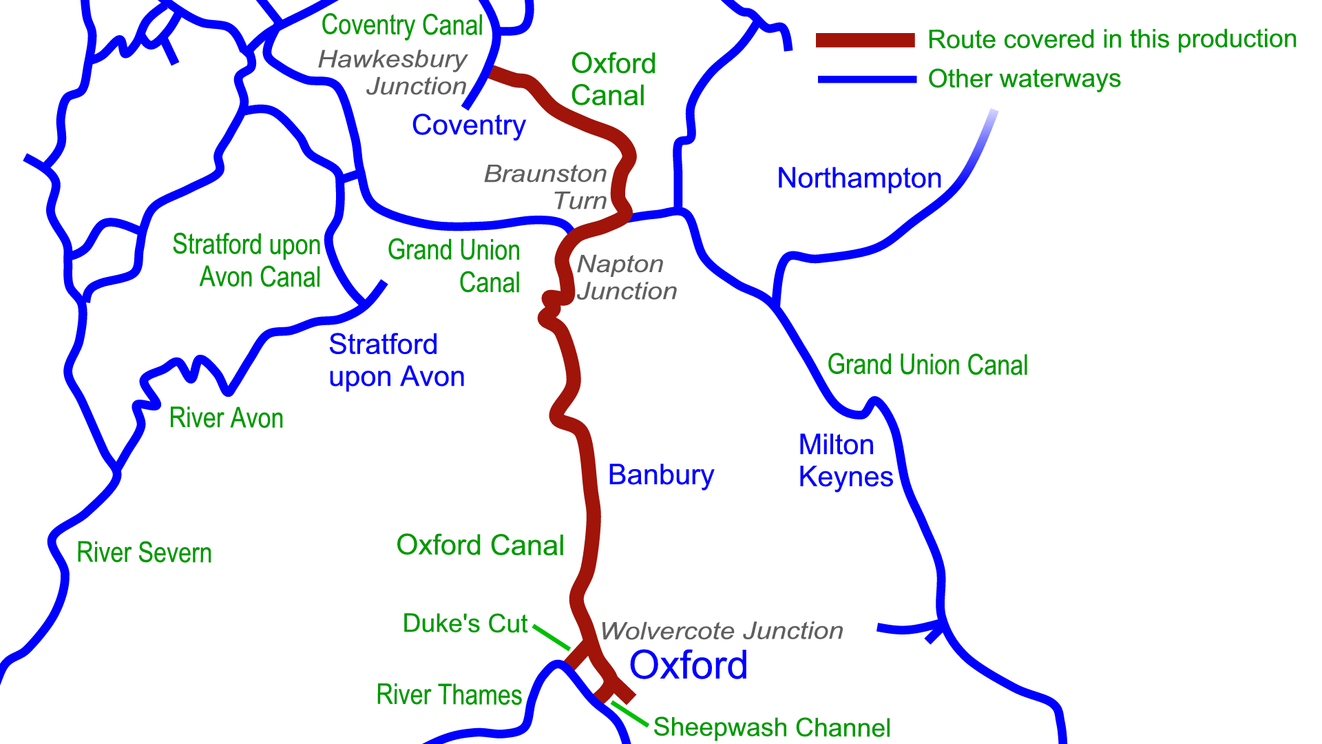 We cruise northbound along the Oxford Canal, including the Sheepwash Channel and Duke’s Cut, passing Napton Junction and Braunston Turn.