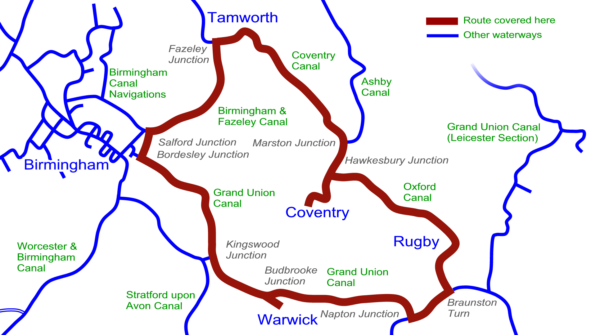 We pass around the centre of Birmingham and along the Birmingham and Fazeley Canal to Fazeley Junction with the Coventry Canal which we follow all the way into Coventry. The Oxford Canal, with the paired locks at Hillmorton, completes our circuit of the Warwickshire Ring.